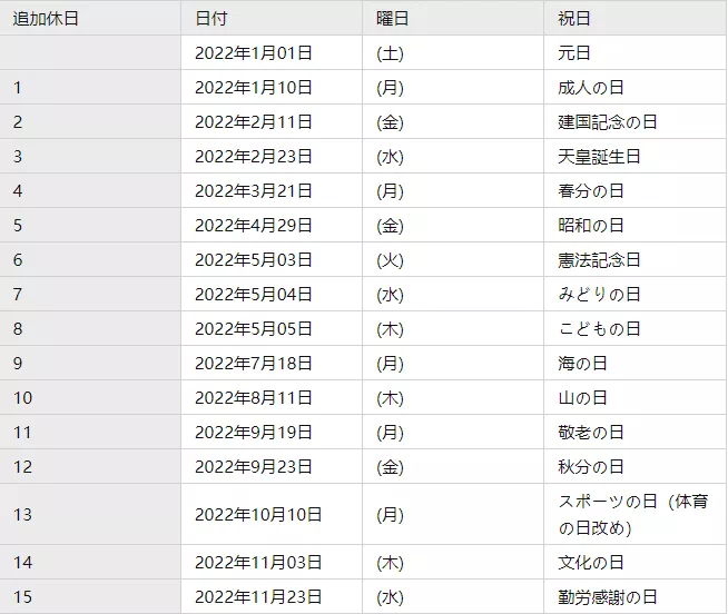 日本的法定節假日有:元旦、成人節、國慶節、春分、昭和の日、憲法紀念日、緑の日、兒童節、海節、山節、敬老節、秋分、體育節、文化節、勞動感恩節、天皇生日,共計16個。
