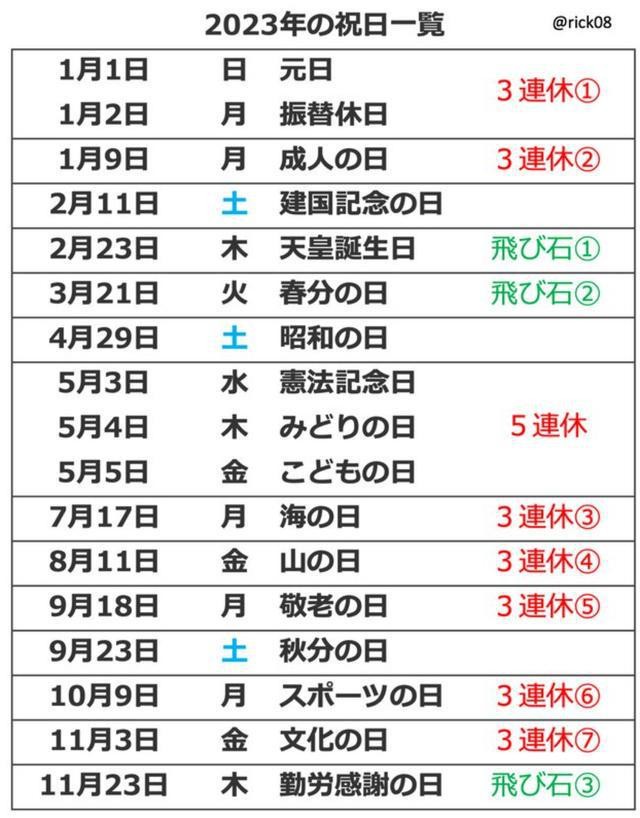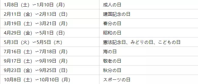 日本的假期則不需要調休,單日假期又多又雜,每個月都有那么幾天在放假。小長假也十分給力,明年五一和新天皇即位放假連在一起,一共可以休10天!另外,如果法定節日趕上周日,那么其后的第一個不是法定節日的那一天也會休息,這一天稱為倒休日。如果兩個節日相隔一天,也就是說第一天和第三天是法定假日,而第二天不是的話,那么第二天也休息。