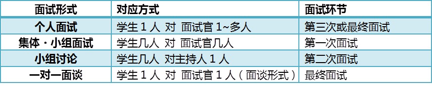 面試通常有【個人面試】【集體?小組面試】【小組討論】【一對一面談】四種形式: